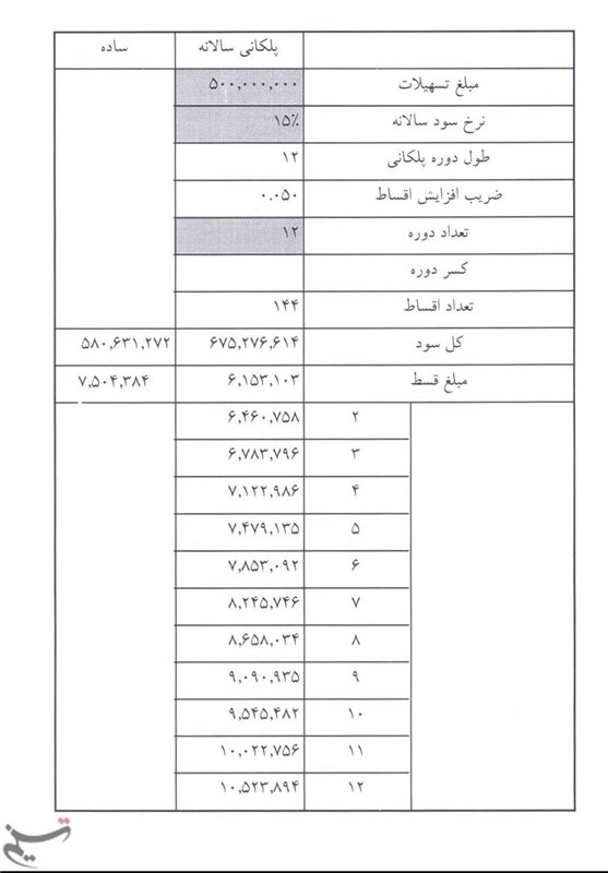 بر اساس این گزارش بازپرداخت تسهیلات 10 میلیون تومانی جعاله 60ماهه بوده که در روش ساده مبلغ اقساط ماهانه 237 هزار و 899 تومان است. در روش ساده بازپرداخت اقساط کل مبلغ سود 4 میلیون و 273 هزار و 958 تومان است.