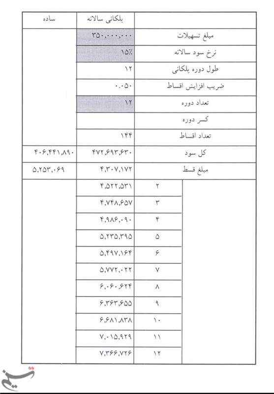 شیب افزایش مبلغ قسط در سال پنجم نیز حدود 5 درصد است و اقساط ماهانه 525 هزار و 539 تومان است.