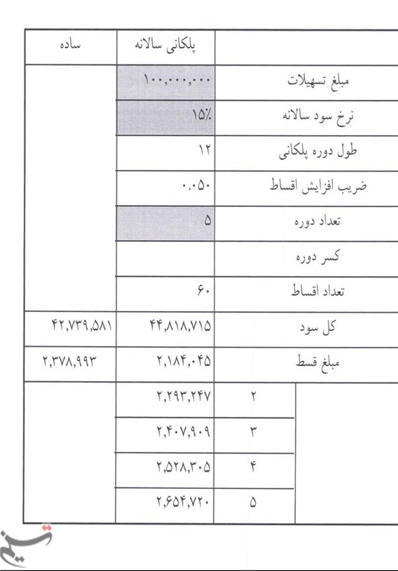 در روش پلکانی سالانه سود تسهیلات 10 میلیون تومانی 4 میلیون و 481 هزار و 871 تومان است. مبلغ قسط سال اول این تسهیلات بهروش پلکانی 218 هزار و 404 تومان است که این رقم در سال دوم به 229 هزار و 324 تومان افزایش مییابد.