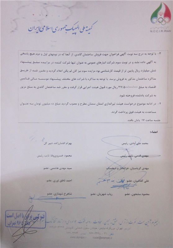 بند 3 همان موضوع مورد بحث است که مربوط به فروش ساختمان کمیته ملی المپیک با قیمت کمتر است. در اصل این نامه خبری از امضای خسرویوفا، مهدی هاشمی، مشحون و رباب شهریان نیست اما در کپی این نامه امضای این افراد دیده میشود و همچنین توضیحات کفاشیان که گفته «مخالف بند 3 هستم.» به چشم نمیخورد.
