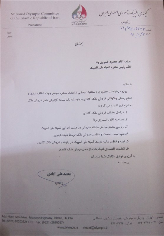 به دنبال این موضوع محمد علیآبادی رئیس کمیته ملی المپیک گفت که خسرویوفا در حالی انتقادها را مطرح میکند که خودش پای نامه فروش ساختمان را امضا کرده است. او در نامهای به تاریخ 23 دی سال 92 این موضوع را خطاب به خسرویوفا اعلام کرد اما اخیرا اسنادی در اختیار خبرگزاری تسنیم قرار گرفته که شبهات درباره این موضوع را بیش از گذشته کرده است.