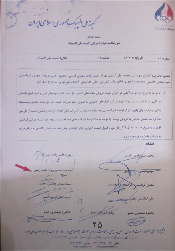در این اسناد صورتجلسه هیئت اجرایی کمیته ملی المپیک به تاریخ آن 11 آبان سال 1389 به چشم میخورد. پای این نامه را محمد علیآبادی، مهدی قدمی، مهدی کرباسیان، احمد ناطقنوری، بهرام افشارزاده و شاهرخ شهنازی امضا کردهاند. امضای کفاشیان نیز پای نامه دیده میشود اما او در کنار امضایش نوشته است: «مخالف بند 3 هستم.»
