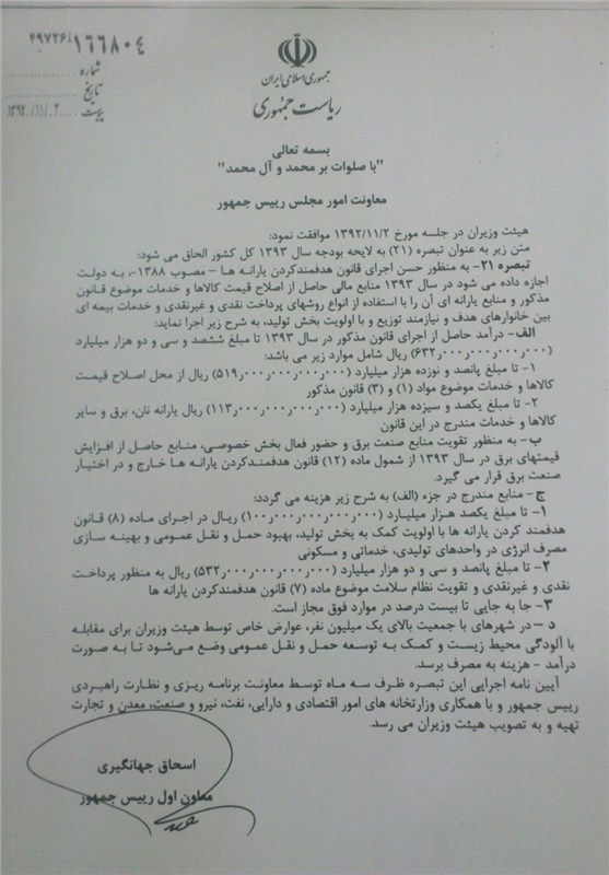 تبصره 21- به منظور حسن اجرای قانون هدفمند کردن یارانه ها ـ مصوب 1388 ـ به دولت اجازه داده می شود در سال 1393 منابع مالی حاصل از اصلاح قیمت کالاها و خدمات موضوع قانون مذکور و منابع یارانه ای آن را با استفاده از انواع روشهای پرداخت نقدی وغیر نقدی وخدمات بیمه ای بین خانوارهای هدف و نیازمند توزیع و با اولویت بخش تولید، به شرح زیر اجرا کند: