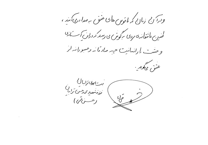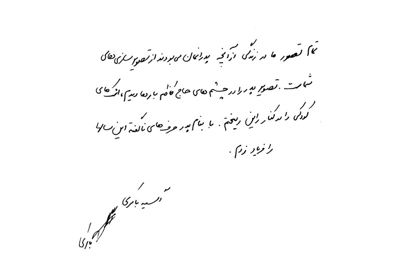 تمام تصویر ما در زندگی از آنچه پدرانمان می‌بودند از تصویر سازی‌های شماست. تصویر پدر را در چشمهای حاج کاظم بارها دیدم و اشکهای کودکی‌ام را در کنار راین ریختم، با به نام پدر حرفهای ناگفته این سالها را فریاد زدم.