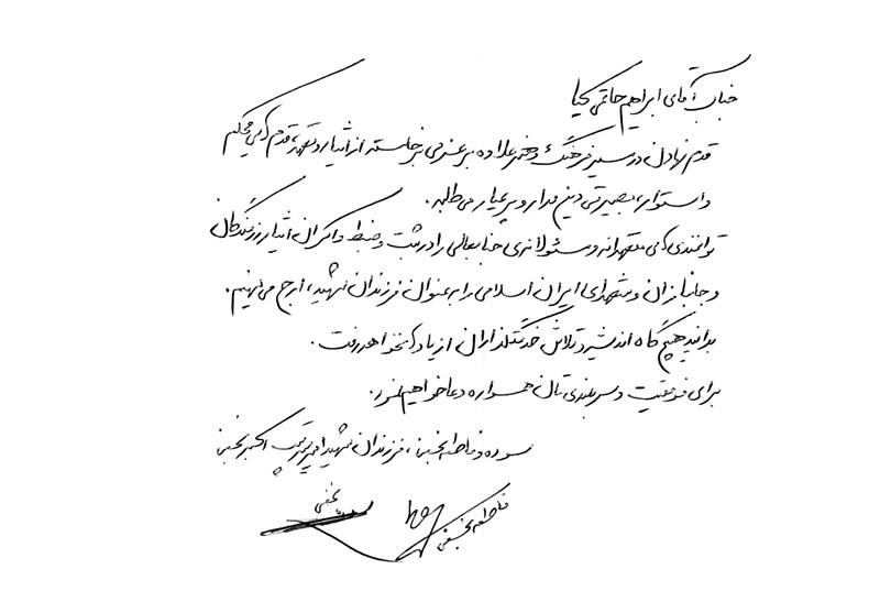 عموجان! آرزو داشتم که ساعت‌ها و ساعت‌ها با تو از غمها و شادی‌های فرزندان  و همسران شهدا بگویم اما «چ» کنم که همیشه: چقدر زود دیر می‌شود! عمو ابراهیم! شما را جوان‌مردی از طایفه کهنه‌عیاران می‌دانم که با وجود تمام آزارها و سختی‌ها و کینه‌های غایبان و فراریان دیروز و حاضران و کاسبان امروز، مردانه بر عهد خود محکم ایستاده‌ای و هنوز قصه کسانی را می‌گویی که رفتند تا راه کربلا را برای تمام دلهای کربلایی باز کنند.