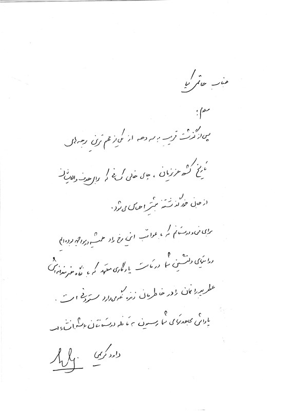 حاتمی‌کیا بودن سخت است، این را خوب می‌دانم! باید جامعه‌ای را که از تو توقعات عجیب و غریب دارد بفهمی، باید مراقب چشمهایی که نگاهت می‌کنند اما تو را نمی‌بینند باشی، باید به گوشهایی که صدایت را می‌گیرند اما حرفت را نمی‌شوند حق بدهی. اما همیشه تحسینت کرده‌ام  که مرد زمانه خویشتنی.