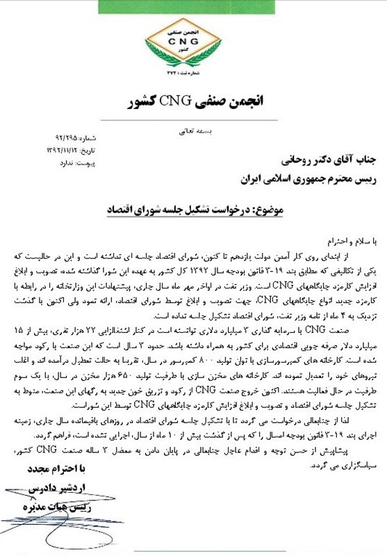 به گزارش خبرگزاری تسنیم، در نامه ارسالی انجمن صنفی CNG به رئیس جمهور آمده است: وزیر نفت در اواخر مهر ماه سال جاری، پیشنهادات این وزارتخانه را در رابطه با کارمزد جدید انواع جایگاههای CNG، جهت تصویب و ابلاغ توسط شورای اقتصاد، ارائه کرد ولی اکنون با گذشت نزدیک به 4 ماه از نامه وزیر نفت، شورای اقتصاد تشکیل جلسه نداده است.