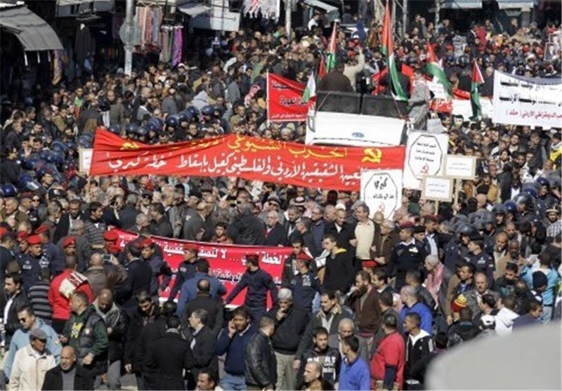 به گزارش گروه بین الملل خبرگزاری تسنیم به نقل از پایگاه خبری «روسیا الیوم»، صدها تن از مردم اردن بعد از نماز جمعه در «امان» تظاهراتی را در محکومیت طرح سازش «جان کری» وزیر خارجه آمریکا میان فلسطینیها و صهیونیستها، برپا کردند.