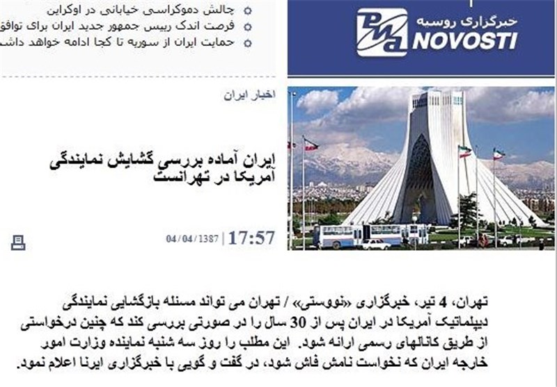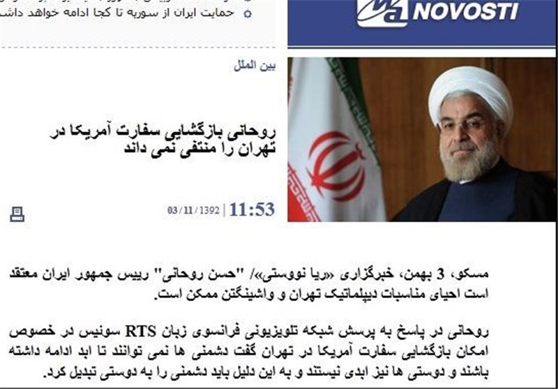 [1] «امکان بازگشایی سفارت آمریکا وجود دارد»- «پایگاه خبری- تحلیلی مشرق» به نقل از «خبرگزاری ریانووستی روسیه» (نسخه فارسی)- 3/11/1392