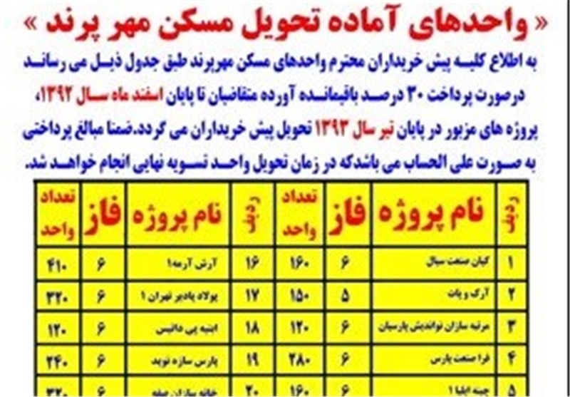 در لیست نهایی شده برای واگذاری 6000 واحد مسکونی مهر، 25 پروژه هر کدام به ظرفیت 150 تا 550 واحد مسکونی در فازهای 5 و 6 برای تحویل در تیر 93 در نظر گرفته شده است. لازم به ذکر است، هم اکنون در پرند جدول زمانی افتتاح های کلیه واحدهای مسکونی مهر در حال ساخت، تنظیم و نهایی شده است و برنامه واگذاری همه واحدهای نیمه تمام در شهر جدید پرند مشخص است که به تدریج خطاب به پیش خریداران اعلام خواهد شد.