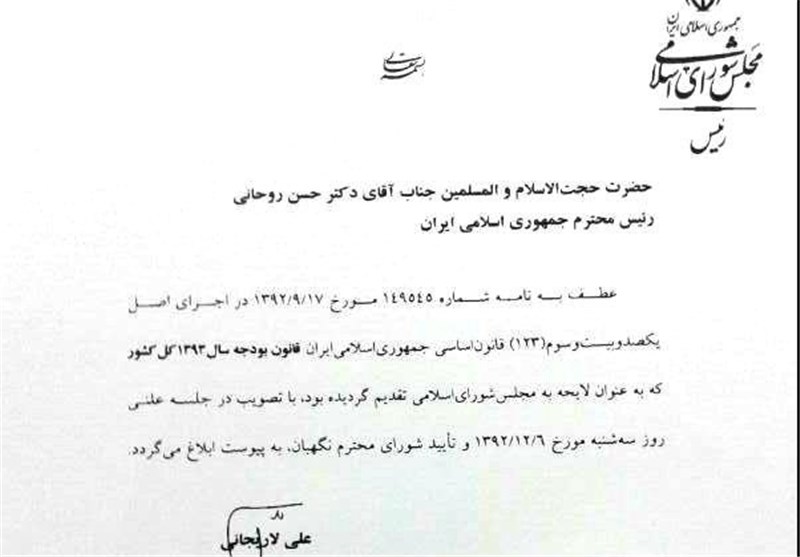 به گزارش خبرنگار پارلمانی خبرگزاری تسنیم، علی لاریجانی رئیس مجلس شورای اسلامی دقایقی پیش در نامهای به حجتالاسلام حسن روحانی رئیسجمهور قانون بودجه سال 1393 کل کشور را برای اجرا ابلاغ کرد.