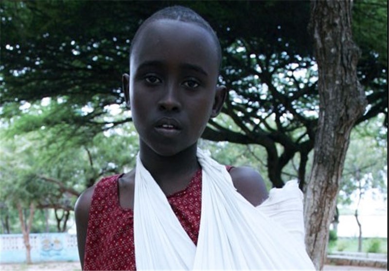 یک کودک بیمار و مجروح سومالیایی در محوطه داخلی بزرگترین بیمارستان شهر موگادیشو که مملو از درخت است