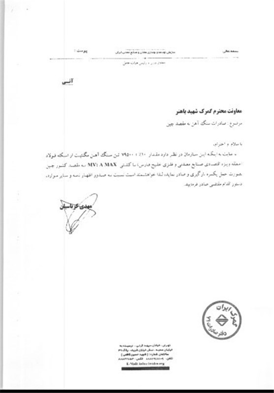 درپی این نامه نگاری، حسن علیدوستی مدیرکل دفتر صادرات گمرک در نامه ای به گمرکات کشور اعلام کرد: بپیوست تصویر نامه شماره 31714مورخ 11/12/92سازمان توسعه ونوسازی معادن وصنایع معدنی ایران منضم به نامه شماره 137349/60مورخ 14/6/92وزیرمحترم صنعت ،معدن وتجارت به همراه نمونه امضاء جناب آقای مهدی کرباسیان بعنوان معاون وزیرورییس هیأت عامل سازمان مذکور جهت امضاء و صدور مجوز ترخیص کالاهای صادراتی مربوطه جهت اقدام با رعایت سایر مقررات ارسال میگردد. خواهشمند است دستور فرمایید مراتب را وفق بخشنامه 322715/833/4/51 مورخ 28/11/85 به کلیه واحدها و گمرکات تابعه نیز ابلاغ نمایند.