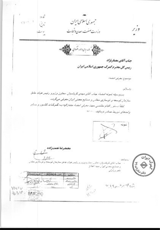 به گزارش خبرنگار اقتصادی خبرگزاری تسنیم، محمدرضا نعمت زاده وزیر صنعت، شهریورماه سال جاری نمونه امضای مهدی کرباسیان مدیرعامل ایمیدرو را برای انجام امور مربوط به صادرات به معمار نژاد رئیس وقت گمرک ابلاغ کرد ولی وقتی کرباسیان مدیرعامل ایمیدرو در اسفند ماه جاری نامه ای را به امضای خود به گمرک شهید باهنر ارسال کرده بود، گمرک مذکور اعلام کرد که این امضا را نمی شناسد که این اتفاق موجب نامه نگاری مجدد مهدی کرباسیان به مسعود کرباسیان مدیرعامل گمرک شد.