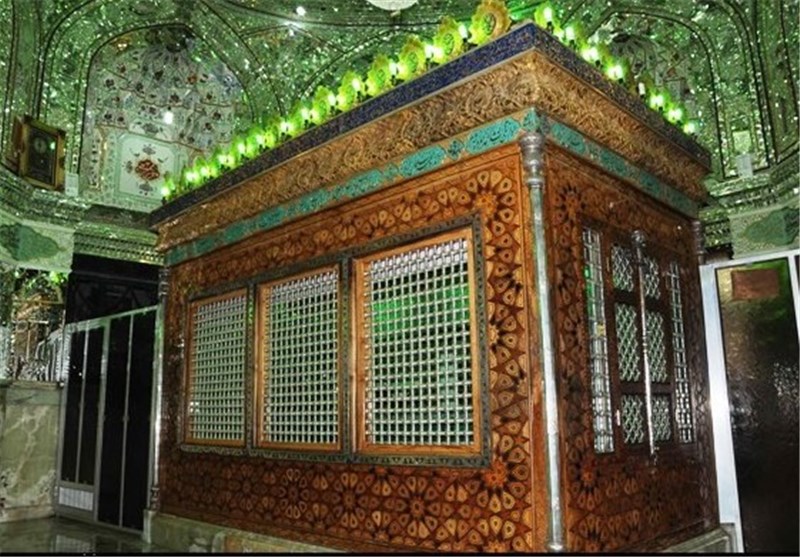 ضریح زیبای حرم با ترکیبی از معرق چوب و فلز به ابعاد 4×3 روی سنگ مزار داخل حرم قرار دارد.