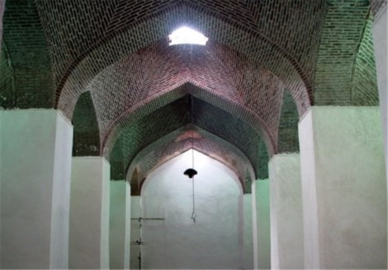 طاق این محوطه شش ضعلی حمام گنبدی شکل است و سربینه هشت ضلعی آن در قسمت جلویی راهروی ورودی قرار دارد. در شش ضلع سربینه، شش صفه برای کندن لباسها ساخته شده است و سقف این صفهها به صورت جناغی است. گرمخانه حمام از سه قسمت مرکزی، خزینه آب سرد و خزینه آب گرم تشکیل شده و دارای سقفی با طاق جناغی است.