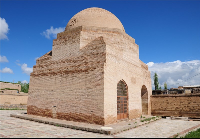 این بنا ابتدا بر روی سه ردیف سنگ سبز تراشیده از آجر ساخته شده است، تا ارتفاع یک متری دور تا دور بنا با کاشیهای شش گوش، به رنگ فیروزه، بنفش، سیاه و سفید پوشیده است برفراز گنبد دو جداره نشسته است. ترکیب کلی تزئینات از موتیفی به نام شمسه از وسط عرقچین سقف با کاربندی زیبایی منشعب شده و این کاربندی به نوبه خود تصاویر را محدود کرده است. گچ بریها از گل و بوته، لچک و ترنج، تصویر خیالی ملائک، درخت تزئینی که همان درخت معروف زندگی است همراه با پرندگان زیبا طراحی شده است.