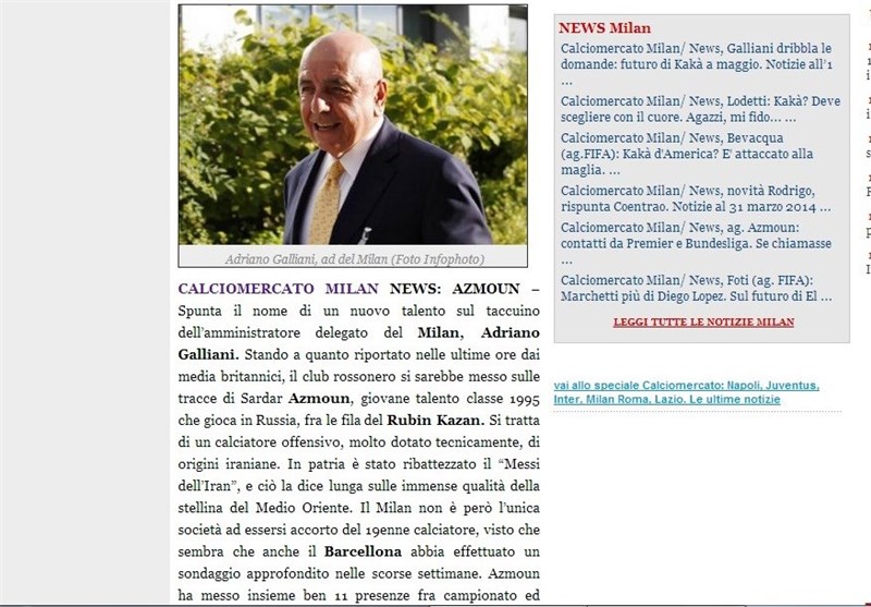 این سایت ایتالیایی در ادامه با اشاره به گزارشهای سایتهای انگلیسی آورده که؛ روسونوری سردار آزمون بازیکن جوان و با استعدادی که متولد سال 1995 است را دنبال میکند که اکنون در لیگ روسیه و تیم روبینکازان بازی میکند.