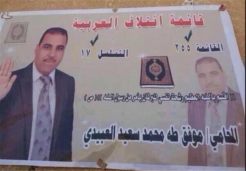 "موفق طه العبیدی" از کاندیدا‌های "فهرست العربیه" در یکی از بنرهای تبلیغاتی خود نوشته است: "به خداوند متعال سوگند یاد می‌کنم که با دستور پیامبر اکرم (ص) خود را کاندیدا کرده‌ام".