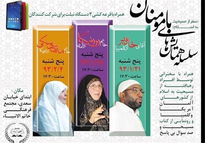 وی خاطرنشان کرد: برگزاری پرسش و پاسخ عمومی و برگزاری قرعه‌کشی از جمله برنامه‌های سلسله همایش "با مؤمنان"، سفر از مسیحیت به اسلام است.