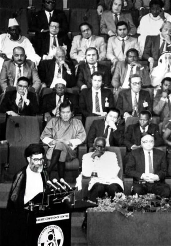 رهبر معظم انقلاب اسلامی در بیاناتی که دوازدهم آبانماه سال 1380 در دیدار با جوانان استان اصفهان داشتند، با اشارهای به سخنرانی خود در هشتمین اجلاس سران جنبش عدمتعهد یادآور شدند: من در زمان ریاست جمهورى، در کنفرانس غیرمتعهدها در زیمبابوه شرکت کردم. کنفرانس غیرمتعهدها عمدتاً در اختیار چپها بود، البته دولتهاى متمایل به غرب و آمریکا هم در آنجا بودند؛ اما کارگردان عمده، یکى رابرت موگابه و دیگرى فیدل کاسترو بود ــ که اینها چپ بودند ــ بقیه رؤساى جمهورِ چپ دنیا هم که طرفدار شوروى بودند، حضور داشتند و عمده کارگردانى در دست اینها بود.