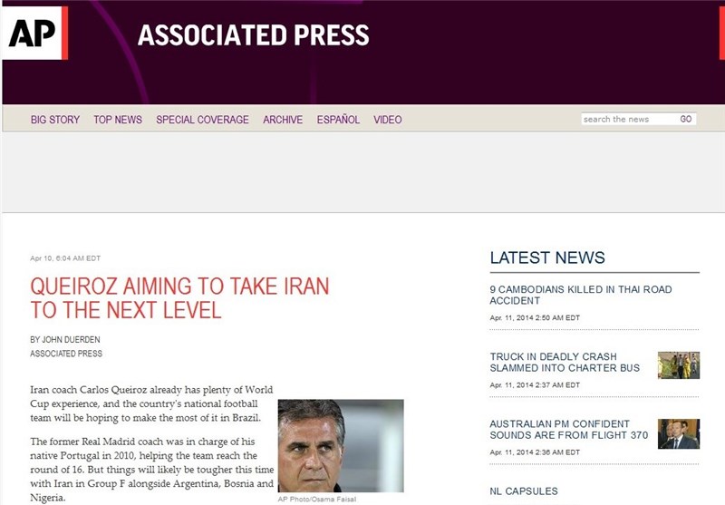 به گزارش خبرگزاری تسنیم، در گزارش خبرگزاری آسوشیتدپرس از عملکرد و وضعیت تیم ملی ایران در آستانه سفر به برزیل برای حضور در جام جهانی 2014 آمده است: کارلوس کیروش، سرمربی تیم ملی ایران با کولهباری از تجربه حضور در جام جهانی به همراه تیمی که امیدوار است از فرصت پیش روی خود در برزیل نهایت استفاده را ببرد، به جام جهانی میرود. سرمربی پیشین تیم فوتبال رئال مادرید، سال 2010 تیم ملی کشورش، پرتغال را به مرحله یک هشتم نهایی جام جهانی آفریقای جنوبی رساند اما تکرار این کار امسال برای او سختتر خواهد بود، چرا که تیم ایران در گروه F باید با تیمهای ملی آرژانتین، بوسنی و هرزگوین و نیجریه روبهرو شود.