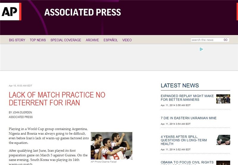 به گزارش خبرگزاری تسنیم، خبرگزاری AP در گزارش خود درباره تیم ملی ایران برای رقابت با تیمهای آرژانتین، نیجریه و بوسنی در گروه F جام جهانی 2014 نوشته است: کار ایران در جام جهانی 2014 سخت است، حتی قبل از آنکه به این موضوع توجه داشته باشید که تمرینات و بازیهای تدارکاتی ناکافی این تیم برای افزایش آمادگیاش کار تیم ملی را برای موفقیت در جام جهانی سختتر کرده است. پس از قطعی کردن صعودش به جام جهانی در ماه ژوئن سال 2013، ایران اولین بازی تدارکاتیاش جهت حضور در جام جهانی را در پنجم ماه مارس مقابل گینه انجام داد و این در حالی بود که کره در همان روز داشت چهاردهمین بازی تدارکاتیاش را انجام میداد.