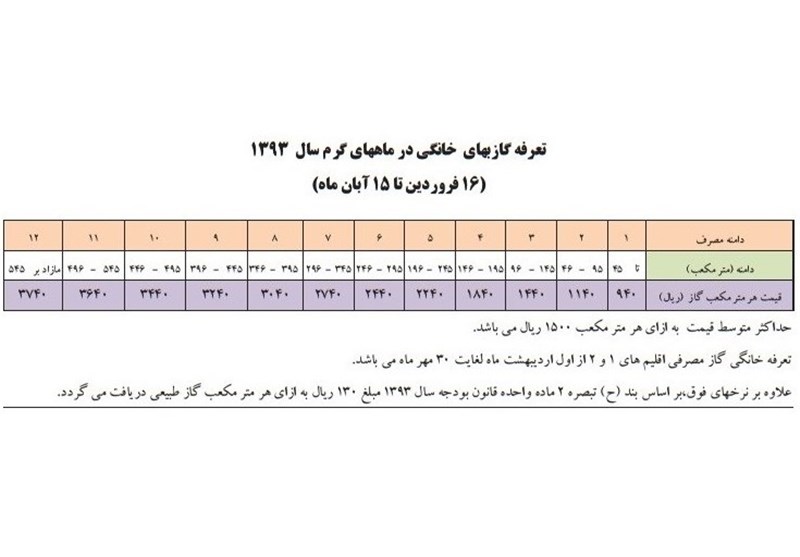 مدیرگازرسانی شرکت ملی گاز ایران در خصوص ارقام مندرج در جدول بالا اظهار داشت: بر این اساس، طبق تعرفههای جدید در سال 93 میزان گازبهای ماهانه مردم در بخش خانگی در فصول گرم سال در کمترین میزان مصرف (تا 45 متر مکعب) بهعلاوه 13 تومان عوارض و همچنین ارزش افزوده و آبونمان، حدود 7 هزار تومان و برای بیشترین میزان مصرف (مازاد بر 545 مترمکعب) حدود 100 هزار تومان است.