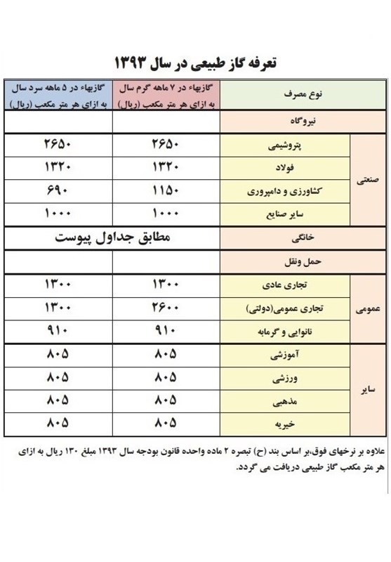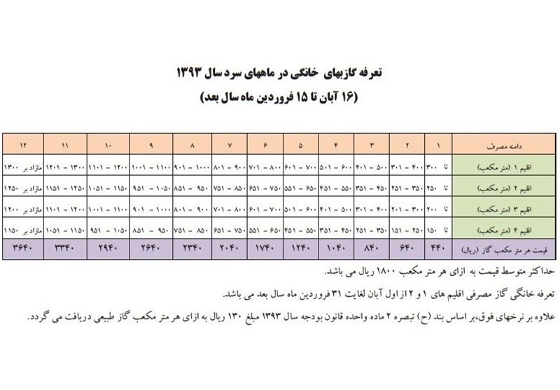 همچنین تعرفه گازبهای خانگی در ماههای سرد سال 93 بدین شرح است: