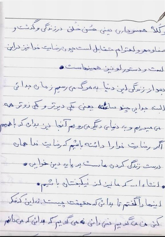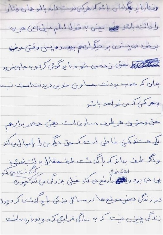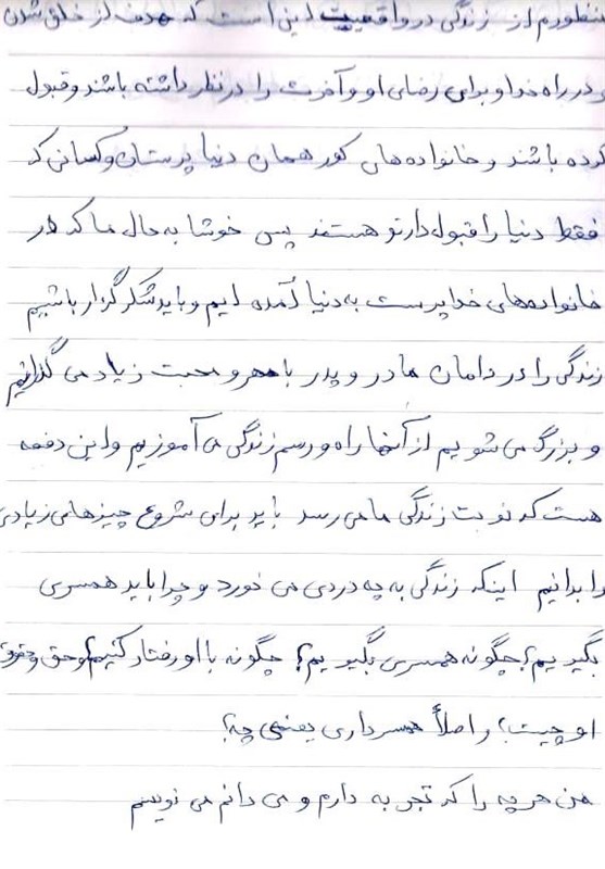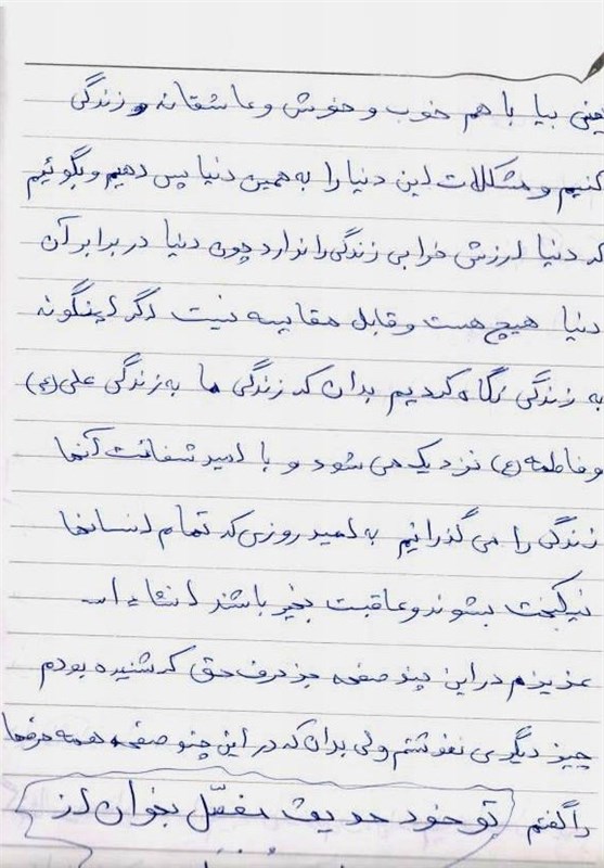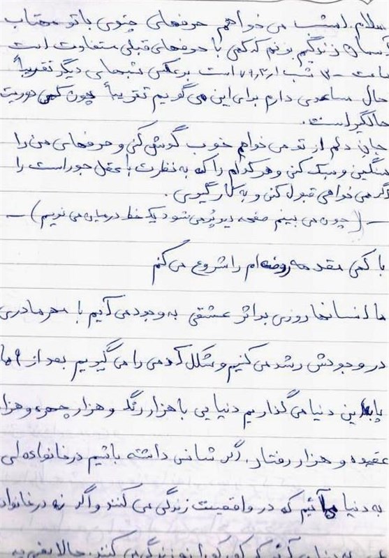 به امید روزی که تمام انسانها نیکبخت شوند و عاقبت بخیر باشند انشاءالله. عزیزم در این چند صفحه جز حرف حقی که شنیده بودم چیز دیگری ننوشتم ولی بدان که در این چند صفحه همه حرفها را گفتم. تو خود حدیث مفصل بخوان از این مجمل. پس واقعبین باش و مرا برای رضای خدا بخواه و کاری کن که من نیز تو را برای رضای او بخواهم.