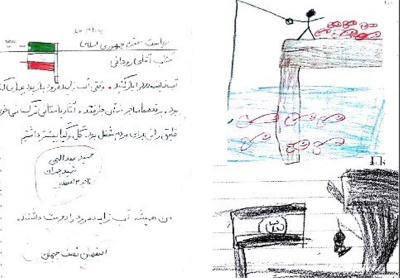 فاطمه خواجویی دانش آموز کلاس پنجم است که در نامه خود به رئیس جمهور آورده است: سلام به شما ریاست محترم من یکی از شهروندهای اصفهان هستم و از شما درخواستهایی دارم که بر روی کاغذ ذکر میکنم. اول از شما میخواهم که آب زاینده رود را باز کنید تا توریستها به شهر ما که به قول بعضی ها نصف جهان است بیایند. دوم این که پرندهها دوباره مثل همیشه به شهر ما بازگردند و سوم اینکه آثار تاریخی شهر که در اثر خشکسالی در حال تخریب است دوباره به شکل همیشگی خود بازگردد و چهارم اینکه برای تفریح در کنار زاینده رود برویم و پنجم کسانی که قایق دارند بیایند و درآمدی داشته باشند و کسانی که با ماهی گیری پول در میآوردند بیایند و ماهی بگیرند و هفتم اینکه هوای اصفهان خنک تر شود و هشتم بیماریها کم شود و کسانی که نمیتوانند به شمال و جنوب بروند به زاینده رود بیایید و لذت ببرند و دهم کشاورزی رونق یابد.