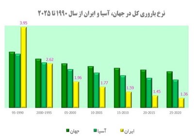 همانگونه که مشاهده می نمایید، براساس این نمودار، در سال های حدفاصل 1995 تا 1990 نرخ باروری در ایران از میانگین آسیا و جهان بیشتر بود اما از سال 95 به این طرف، این نرخ کاهش بی سابقه ای داشته و در نهایت پیش بینی شده است که در سال 2025 به یک فاجعه انسانی در ایران اسلامی منجر شود.