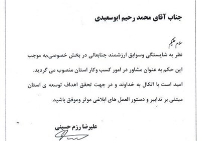 به گزارش خبرگزاری تسنیم از کرمان، در حکم رزم حسینی خطاب به ابوسعیدی آماده است: نظر به شایستگی و سوابق ارزشمند جنابعالی در بخش خصوصی، به موجب این حکم به عنوان مشاور در امور کسب و کار استان منصوب میگردید.