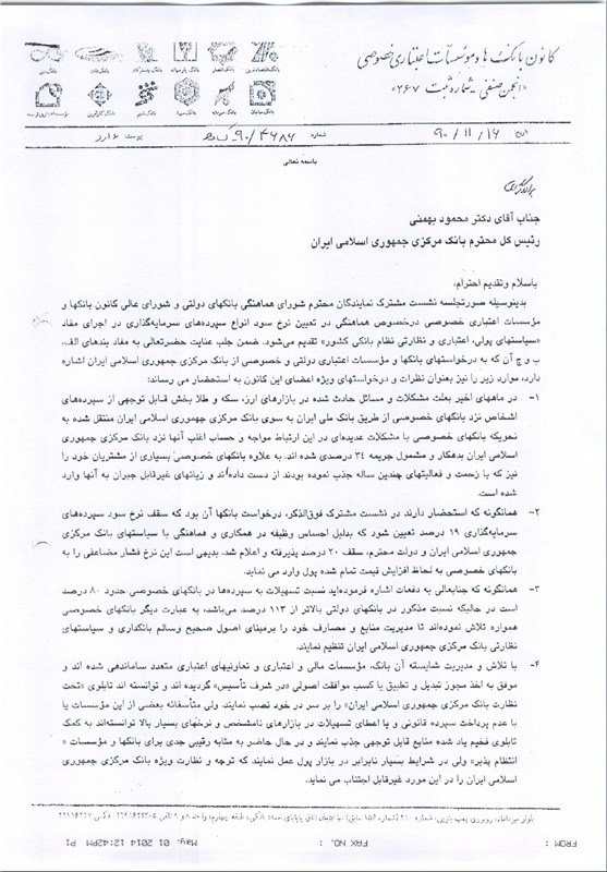 صورتجلسه ای که منجر به صدور این اطلاعیه مشترک شد نیز 8 روز بعد در قالب نامه ای از جانب کانون بانک ها و مؤسسات اعتباری خصوصی به محمود بهمنی رئیس کل وقت بانک مرکزی ارسال شد.