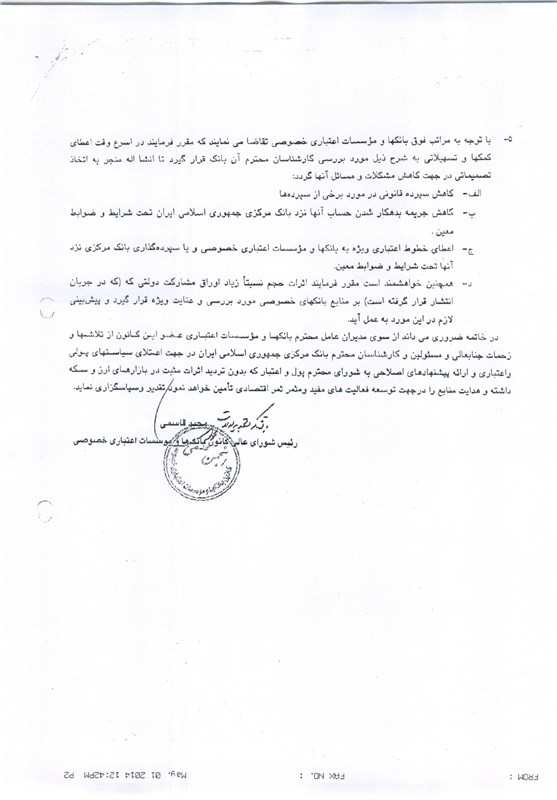 5-با توجه به مراتب فوق بانکها و مؤسسات اعتباری خصوصی تقاضا مینمایند که مقرر فرمایند در اسرع وقت اعطای کمکها و تسهیلاتی به شرح ذیل مورد بررسی کارشناسان محترم آن بانک قرار گیرد تا انشاءالله منجر به اتخاذ تصمیماتی در جهت کاهش مشکلات و مسائل آنها گردد: