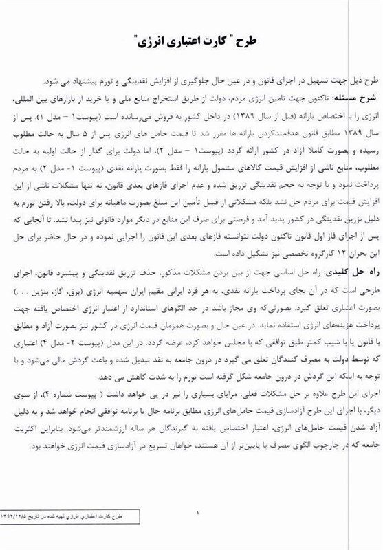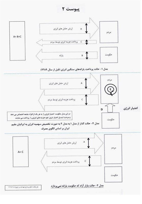 راه حل کلیدی: راه حل اساسی جهت از بین بردن مشکلات مذکور، حذف تزریق نقدینگی و پیشبرد قانون، اجرای طرحی است که در آن به جای پرداخت یارانه نقدی، به هر فرد ایرانی مقیم ایران سهمیه انرژی (برق، گاز، بنزین ...) به صورت اعتباری تعلق گیرد. به صورتی که وی مجاز باشد در حد الگوهای استاندارد از اعتبار انرژی اختصاص یافته جهت پرداخت هزینههای انرژی استفاده نماید. در عین حال و به صورت همزمان قیمت انرژی در کشور نیز به صورت آزاد و مطابق با قانون یا با شیب کمتر طبق توافقی که با مجلس خواهد کرد عرضه گردد. در این مدل (پیوست 2 - مدل 4) اعتباری که توسط دولت به مصرفکنندگان تعلق میگیرد در درون جامعه به نقد تبدیل شده و باعث گردش مالی میشود و با توجه به اینکه این گردش در درون جامعه شکل گرفته است تورم را به شدت کاهش میدهد.