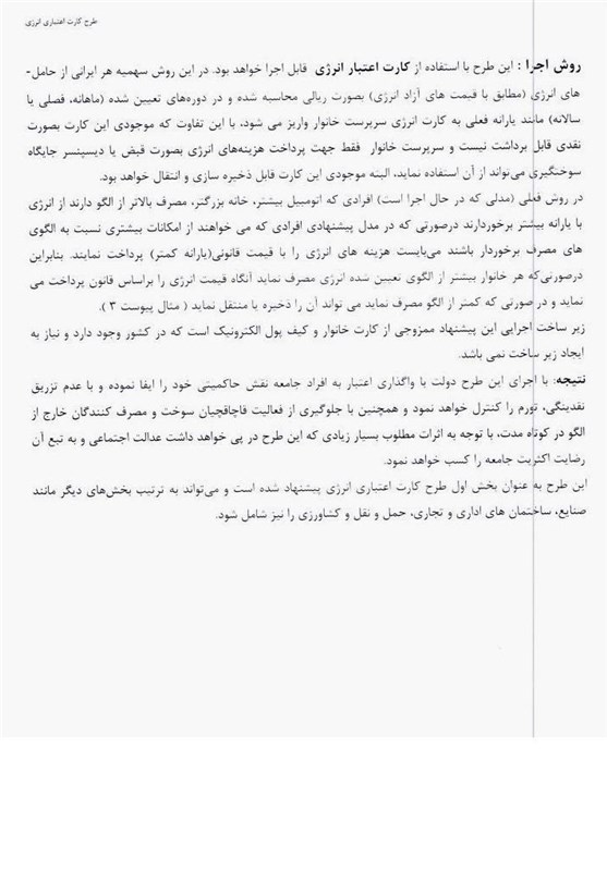روش اجرا: این طرح با استفاده از کارت اعتباری انرژی قابل اجرا خواهد بود. در این روش سهمیه هر ایرانی از حامل های انرژی (مطابق با قیمتهای آزاد انرژی) به صورت ریالی محاسبه شده و در دورههای تعیین شده (ماهانه، فصلی یا سالانه) مانند یارانه فعلی به کارت انرژی سرپرست خانوار واریز میشود. با این تفاوت که موجودی این کارت به صورت نقدی قابل برداشت نیست و سرپرست خانوار فقط جهت پرداخت هزینههای انرژی به صورت قبض یا دیسپنسر جایگاه سوختگیری میتواند از آن استفاده نماید. البته موجودی این کارت قابل ذخیرهسازی و انتقال خواهد بود.