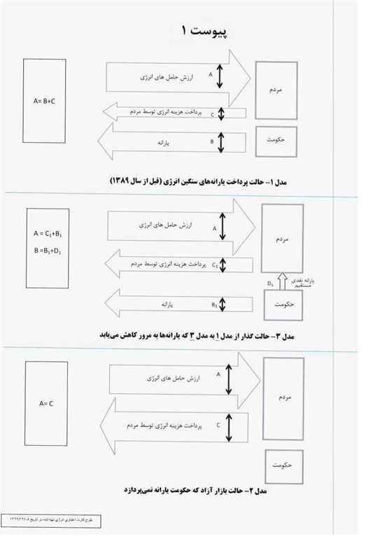 شرح مسئله: تاکنون جهت تامین انرژی مردم، دولت از طریق استخراج منابع ملی و با خرید از بازارهای بینالمللی، انرژی را با اختصاص یارانه (قبل از سال 1389) در داخل کشور به فروش میرسانده است (پیوست 1 - مدل 1) پس از سال 1389 مطابق قانون هدفمند کردن یارانهها مقرر شد تا قیمت حاملهای انرژی پس از 5 سال به حالت مطلوب رسیده و به صورت کاملا آزاد در کشور ارائه گردد (پیوست 1 - مدل 2)، اما دولت برای گذار از حالت اولیه به حالت مطلوب، منابع ناشی از افزایش قیمت کالاهای مشمول یارانه را فقط به صورت یارانه نقدی (پیوست 1 - مدل 2) به مردم پرداخت نمود و با توجه به حجم نقدینگی تزریق شده و عدم اجرای فازهای بعدی قانون، نه تنها مشکلات ناشی از این افزایش قیمت برای مردم حل نشد بلکه مشکلاتی از قبیل تامین این مبلغ به صورت ماهیانه برای دولت، بالا رفتن تورم به دلیل تزریق نقدینگی در کشور پدید آمد و فرصتی برای صرف این منابع در دیگر موارد قانونی نیز پیدا نشد. تا آنجایی که پس از اجرای فاز اول قانون تاکنون دولت نتوانسته فازهای بعدی این قانون را اجرایی نموده و در حال حاضر برای حل این بحران 12 کارگروه تخصصی نیز تشکیل داده است.