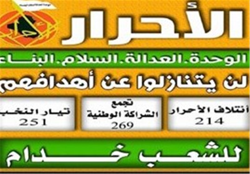 "ائتلاف الاحرار" وابسته به جریان صدر با شعار "وحدت، عدالت، صلح، سازندگی"