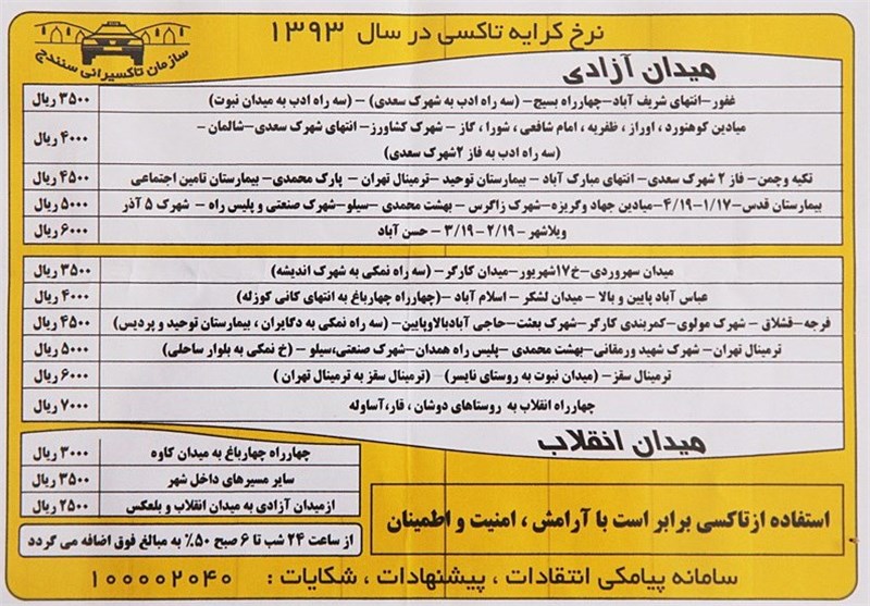 معاون فرماندار سنندج در گفتوگو با خبرنگار تسنیم در سنندج درباره نرخ مصوب کرایه تاکسی برای سال 93 اظهار کرد: افزایش نرخ کرایه تاکسیها از 15 اردیبهشت ماه به شورای شهر و سازمان تاکسیرانی ابلاغ شده که با نظرات شورای شهر و فرمانداری مبلغ نرخ تاکسی ها 30 درصد افزایش یابد که با تایید شهرداری و فرمانداری برچسب آنها آماده شده و به رانندگان تاکسی تحویل داده میشود تا از پارهای ابهامات و تخلفات جلوگیری شود.