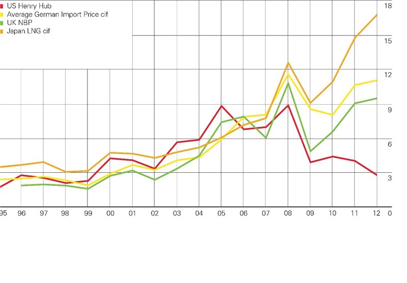 در زیر نمودار متوسط قیمت گاز در 4 کشور جهان یعنی آمریکا، آلمان، انگلیس و ژاپن آمده است. توجه کنید که قیمتها تا حوالی سال 2009 کم و بیش با هم تغییر می کرده است ولی از آن زمان بوده است که انقلاب گاز رسوبی در آمریکا باعث کاهش قیمت گاز در امریکا شده است و این کاهش قیمت در تقابل با باقی کشورهاست که در آنها قیمت زیاد شده است. ژاپن به طور خاص افزایش قیمت شدیدی را تجربه کرده است به خصوص به دلیل آنکه پس از فاجعه سونامی در سال 2011 که منجر به تشعشعات اتمی شد ژاپن و برخی کشورهای پیشرفته دیگر تصمیم به حذف تدریجی نیروگاههای اتمی خودشان گرفتند. با توجه به اینکه در کوتاه مدت امکان افزایش واردات گاز در ژاپن وجود نداشت، قیمتها افزایش زیادی داشته است. البته این فاصله قیمتی باعث افزایش سرمایه گذاری برای انتقال گاز شده و در نتیجه نهایتا در طول زمانهای طولانی این فاصله کمتر خواهد شد ولی لاجرم همیشه قابل توجه باقی خواهد ماند.