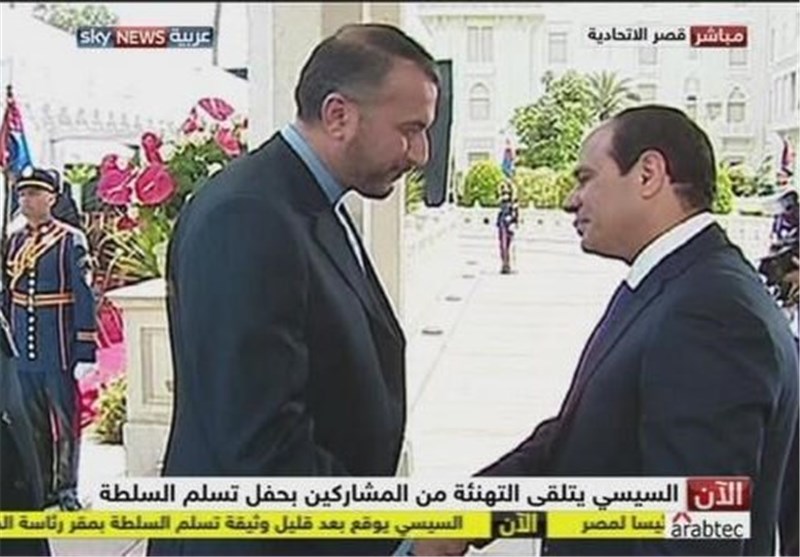 به گزارش گروه بین الملل خبرگزاری تسنیم، حسین امیرعبداللهیان معاون عربی و آفریقای وزیر امور خارجه کشورمان که به نمایندگی از سوی حسن روحانی رئیس جمهوری ایران برای شرکت در مراسم آغاز به کار عبدالفتاح السیسی به عنوان رئیس جمهوری جدید این کشور عازم قاهره شده بود با حضور در کاخ الاتحادیه ضمن دیدار با السیسی انتخاب وی را تبریک گفته و برای او آرزوی موفقیت و کامیابی کرد.