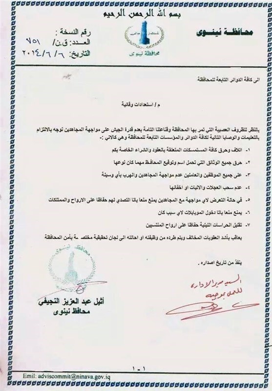 به گزارش گروه بین الملل خبرگزاری تسنیم به نقل از پایگاه خبری عراق القانون، بسیاری از منابع خبری عرب زبان سندی را از خیانت استاندار نینوی منتشر کردند که طی آن وی