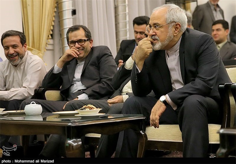 فیلم زیر ظریف را در کنار سایر اعضای تیم مذاکره کننده و برخی اصحاب رسانه در مقر نمایندگی دائم ایران نزد ملل متحد در وین نشان میدهد.