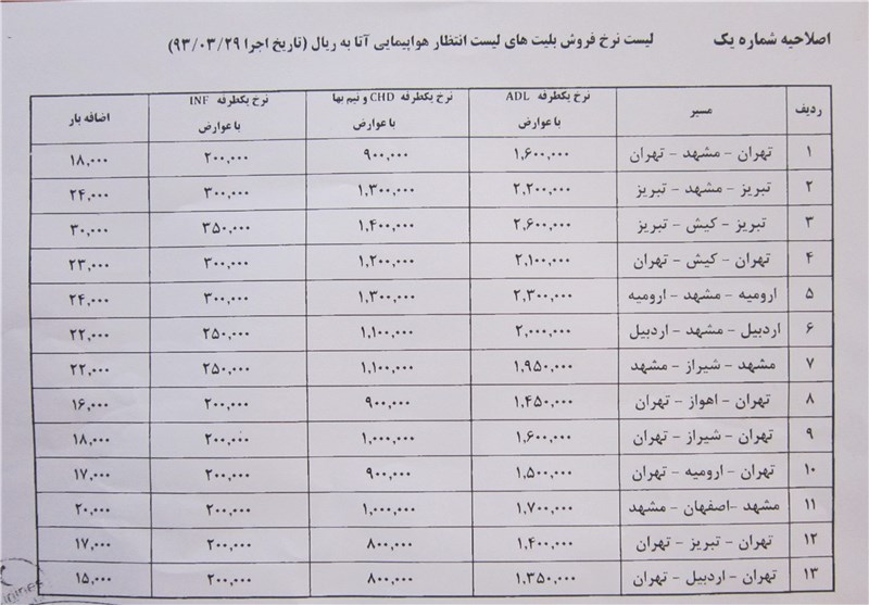 نرخ بلیت در مسیر مشهد ــ شیراز و بالعکس نیز برای بزرگسالان 195 هزار، کودکان 110 هزار و کودکان کمتر از دو سال 25 هزار تومان بوده که هزینه اضافه بار در این مسیر پروازی 2200 تومان است.