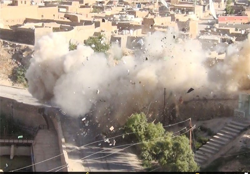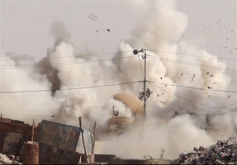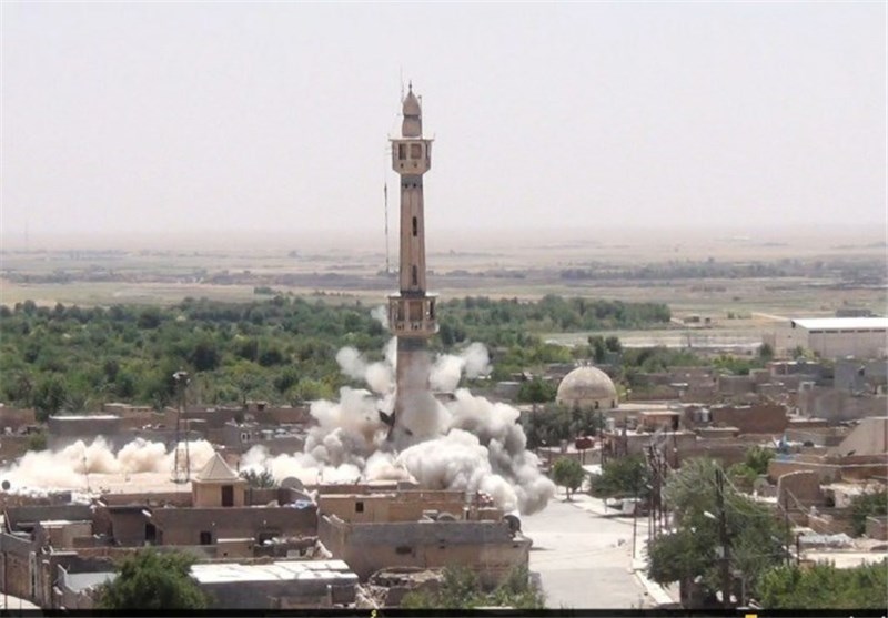 در این تصاویر عناصر داعش با استفاده از بولدوزر و بمبگذاری این اماکن اقدام به تخریب آنها میکنند.
