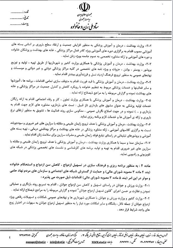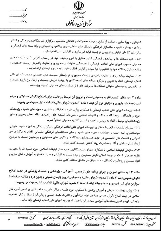 پاسخ به این سؤالات مهم ما را بهدنبال اسناد نوشتهشدن این سیاستهای مشوقانه ترغیب کرد، سیاستهایی که توسط شورای عالی انقلاب فرهنگی در دولت گذشته نوشته شد و موجبات تأسیس ستاد ملی زن و خانواده را فراهم کرد، این ستاد بهعنوان دستگاه اجرایی در زمینههای مختلف زنان و خانواده این موضوع را به دولت ارجاع داد و بر همین اساس دبیرخانه شورای ملی زن و خانواده در مرکز امور زنان و خانواده ریاست جمهوری تشکیل شد.
