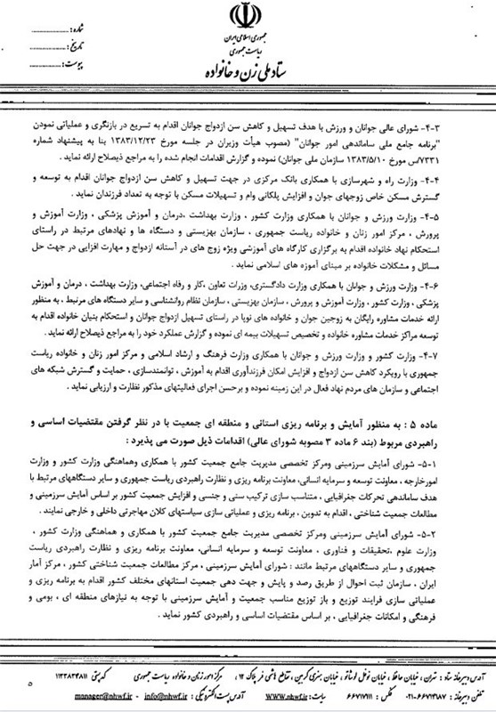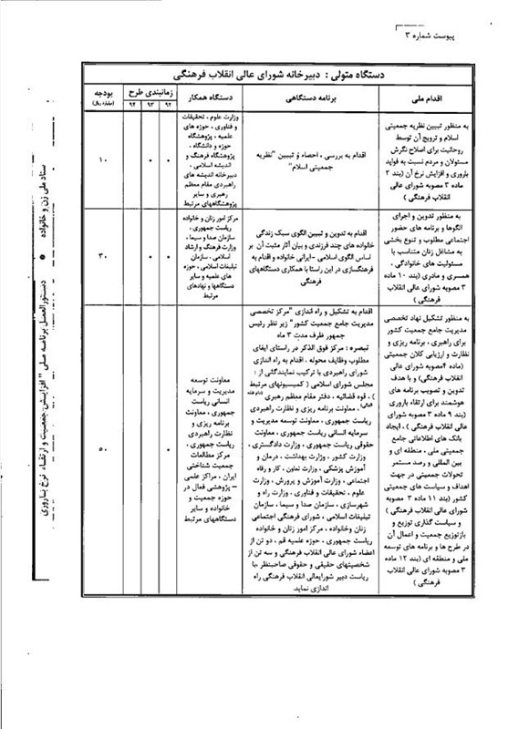 به‌عنوان نمونه به‌منظور برنامه‌ریزی فرهنگ‌سازی در تسهیل ازدواج، کاهش سن ازدواج و استحکام خانواده که مورد تأکید بند 3 و 4 مصوبه شورای عالی انقلاب فرهنگی بود، حمایت از گسترش شبکه‌های اجتماعی و سازمان‌های مردم‌نهاد را که در این امر مؤثرند از وزارت کشور خواسته و برای آن 300 میلیارد ریال بودجه برای سال‌های 92، 93، 94 یعنی برای 3 سال در نظر گرفته شد.