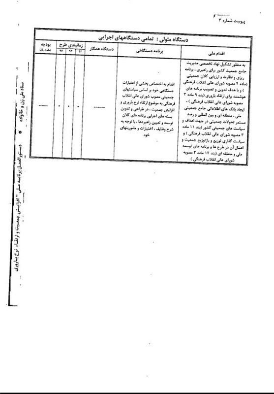 برای اینکه این مشوقها عملیاتی شود و بودجه به آن تعلق گیرد، برنامه ملی افزایش جمعیت و ارتقای نرخ باروری در آن ستاد بر اساس سیاستهای جمعیتی مصوب شورای عالی انقلاب فرهنگی پیرو جلسات 709 تا 712 مورخ 22/1/91 ، 5/2/91، 19/2/91 و 2/3/91 نوشته شد؛ در عین حال این برنامه هم کاملاً برای تک تک دستگاهها نوشته شد و بودجهای برای هرکاری که برای آن دستگاه دیده شد پیشبینی شد که در انتهای این گزارش اسناد آن را منتشر میکنیم.