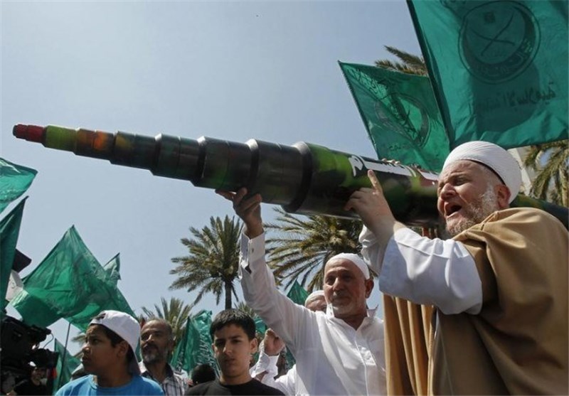 یک تظاهراتکننده سنی در لبنان ماکتی از یک موشک به دست گرفته و با آن اعتراض خود به حملات اسرائیل به نوار غزه را نشان داده است